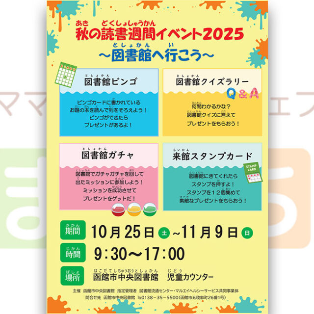 イベント 秋の読書週間イベント2025~図書館へ行こう~ 10月25日(土)~11月9日(日) 2025年10月25日(土)~11月9日(日)【秋の読書週間イベント2025~図書館へ行こう~】が開催されます♪ おやこキッズ体験 2025.10.17 おやこイベントキッズ