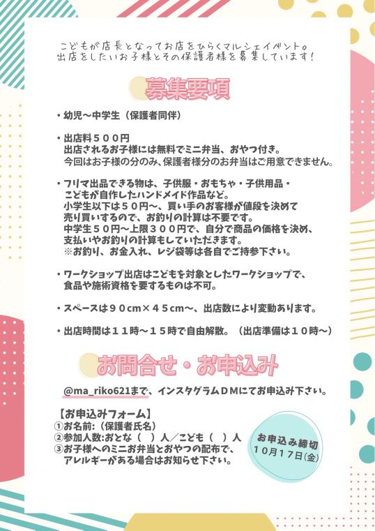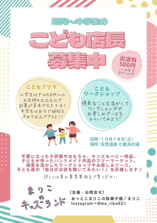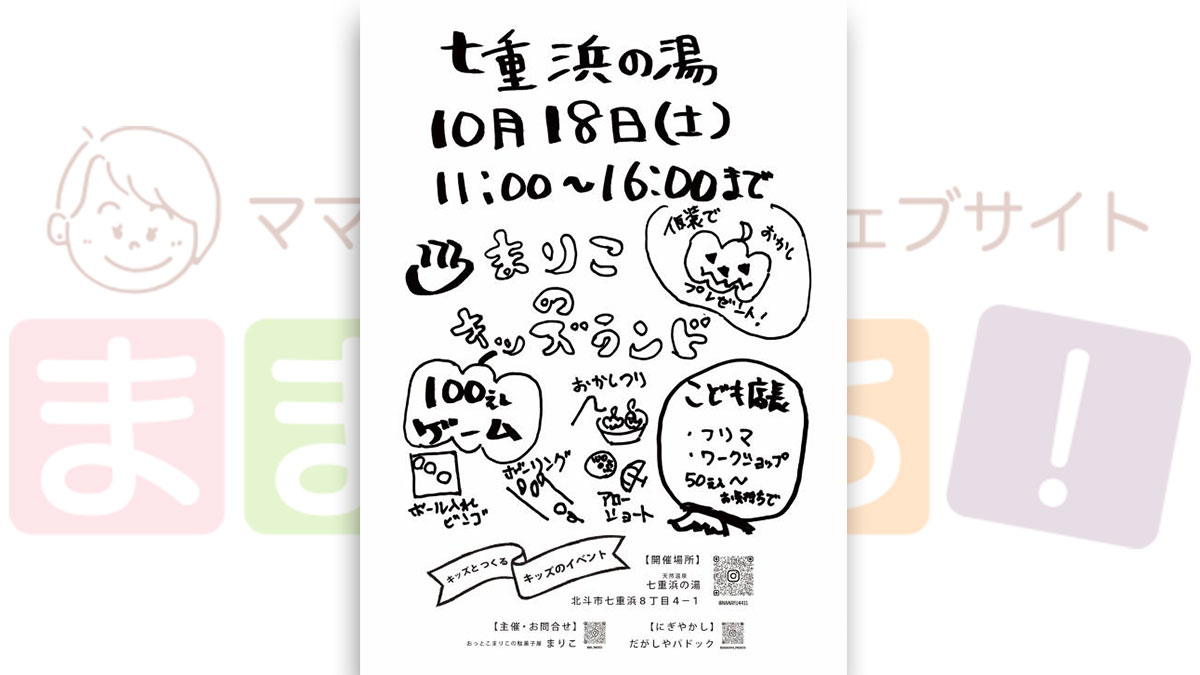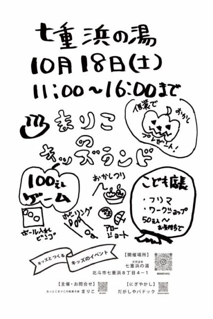 まりこのキッズランド イベント 2025.10.14 2025年10月18日(土) 開催場所 天然温泉 七重浜の湯 キッズとつくるキッズのイベント 函館市の駄菓子屋・おっとこまりこの駄菓子屋プレゼンツ&北斗市の駄菓子屋・だがしやパドックがにぎやかしのW駄菓子屋でお楽しみ下さい😆 こどもたちが店長になって開くフリマやワークショップ!ぜひ応援してね♪ 100円で遊べるコーナーも! 時間 11:00~16:00 \Instagram/ おっとこまりこだがしやパドック七重浜の湯 仮装して行くとお菓子プレゼントだそうですよ🎃