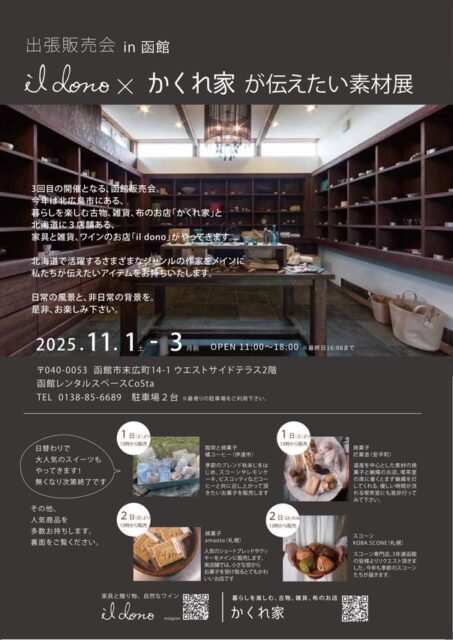 北海道に3店舗ある、家具と雑貨、ワインのお店「il dono」がやってきます。