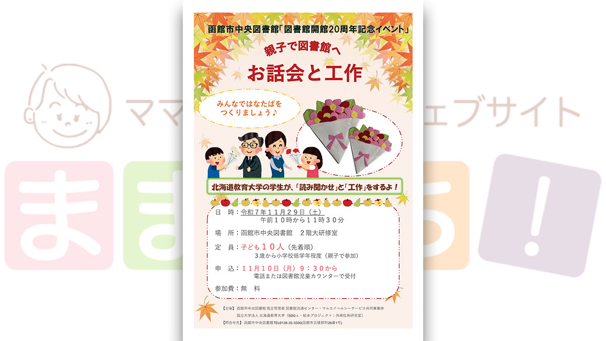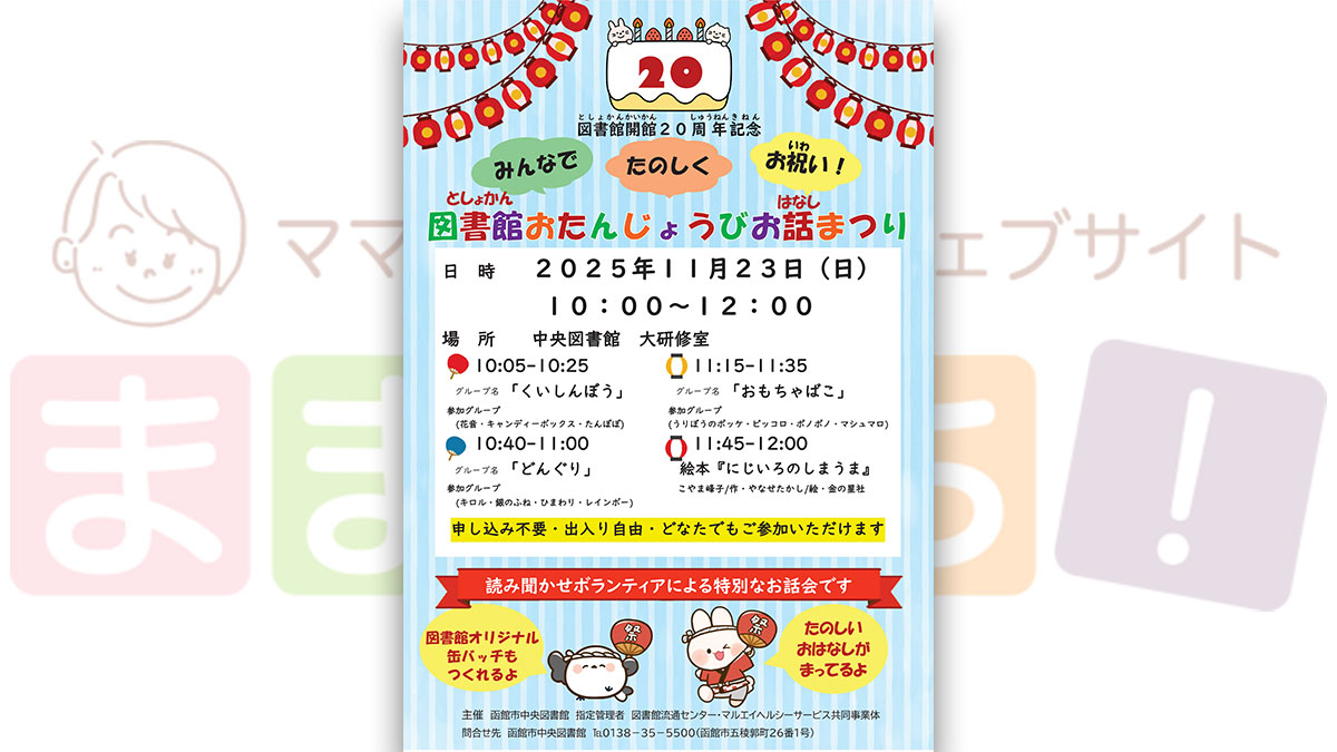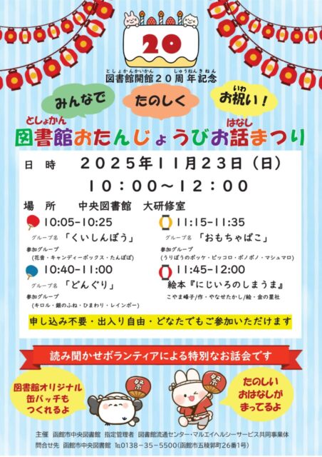 【図書館開館20周年記念イベント】みんなで たのしく お祝い!図書館おたんじょうびお話まつり イベント 2025.11.11 2025年11月23日(日) 開催場所 函館市中央図書館 大研修室 図書館開館20周年記念イベントです✨ 読み聞かせボランティアによる特別なお話会です♪ 会場では図書館オリジナル缶バッチも作れます! 時間 10:00~12:00 対象 出入り自由、どなたでもご参加いただけます 参加料 無料 申込受付 申込不要、当日直接会場へお越しください。 みんで図書館のおたんじょうびをお祝いしよう🎂 お問い合わせ 函館市中央図書館 電話番号 0138-35-5500