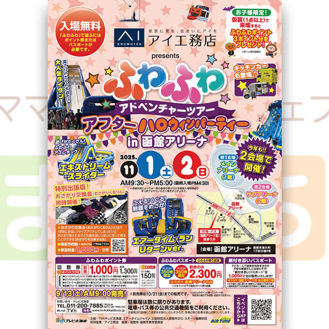 イベント アイ工務店 presents ふわふわアドベンチャーツアー アフターハロウィンパーティーin 函館アリーナ 11月1日(土)~11月2日(日) 2025年11月1日(土)2日(日)【アイ工務店 presents ふわふわアドベンチャーツアー アフターハロウィンパーティーin 函館アリーナ】遊びがたくさん!ふわふわで楽しもう! おやこ遊び 2025.10.03 おやこイベント